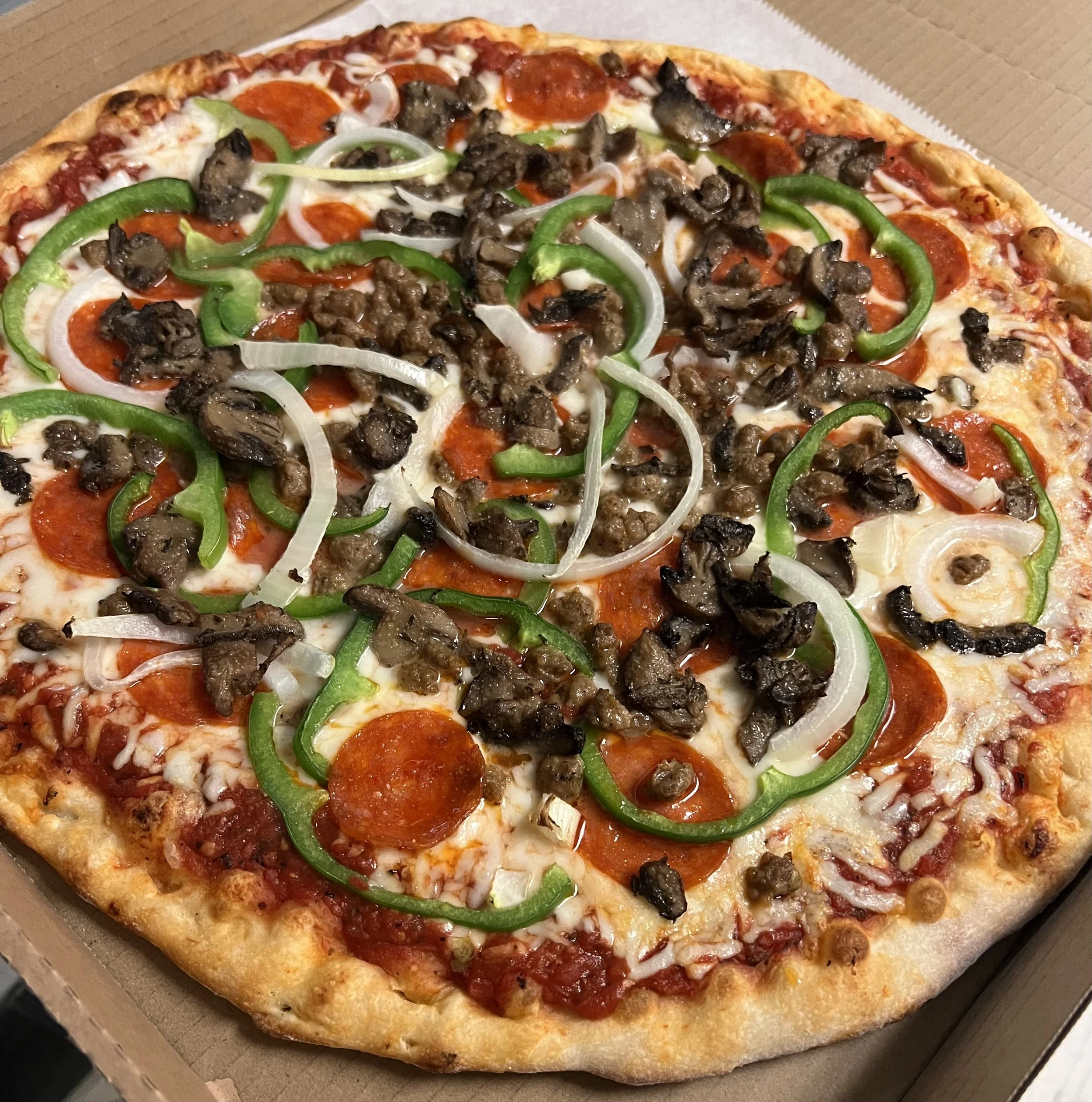 Green peppers, onions, pepperoni, sausage and mushrooms.